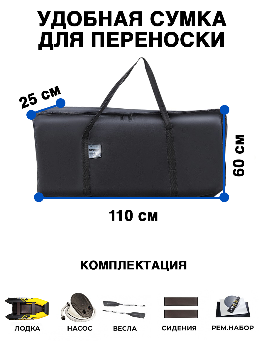 | Комплектация | Лодка, 2 сидения, 2 весла разборных, ножной насос 5 литров, рем.комплект, сумка |