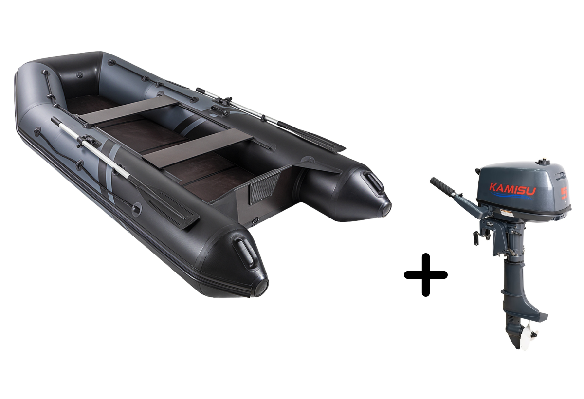 Представляем вашему вниманию стильный комплект для рыбалки и путешествий — надувная лодка БРОНЯ-320 СК в элегантном графитово-черном исполнении с надежным мотором KAMISU T 5 BMS. Этот тандем создан для тех, кто ценит комфорт и практичность.