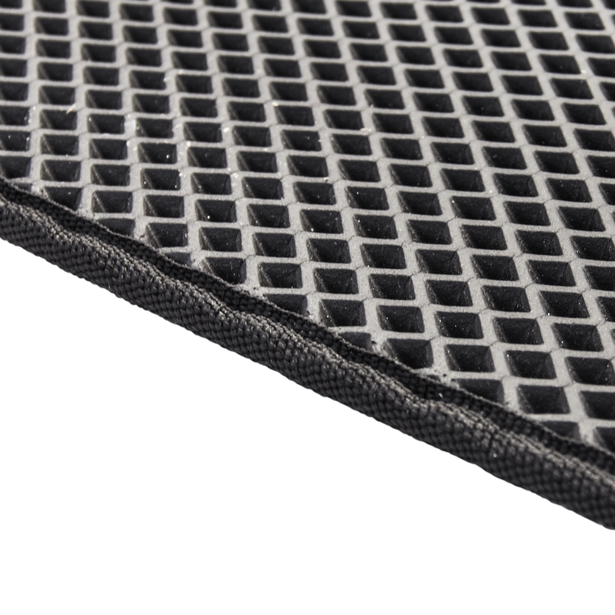 Материал обладает теплоизоляционными свойствами, эластичен и пластичен, не меняет структуру в температурном диапазоне от -65 до +85°С, повторяя рельеф укрываемой поверхности. Этиленвинилацетат, он же вспененный каучук - имеет "нулевое" влагопоглощение, т.е. не впитывает жидкости, а грязь и песок легко удаляются, просто ополоснув коврик водой. Материал EVA отличается пружинистостью, поглощает удары и смягчает нагрузку. Он химически толерантен и не разрушается при контакте с агрессивными средами. Также, этиленвинилацетат не создает благоприятную среду для жизнедеятельности грибка и плесени. Поверхность коврика не скользящая, состоит из ромбовидных ячеек. Эти ячейки собирают основную массу песка и грунта, не давая крупицам повреждать ткань лодки, забиваясь в пространство между палубой и бортом. Окантовка из прочной стропы придает изделию эстетичный внешний вид, В свернутом виде коврик фиксируется застежкой на "липучке". При всех достоинствах коврик EVA имеет малый вес.